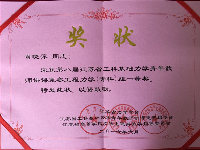 经过两轮激烈比赛,本届讲课竞赛于5月29日下午顺利结束。本届竞赛组委会顾问、江苏省力学学会监事、南京航空航天大学吴文龙教授当场宣布了竞赛结果,我校黄晓萍老师获得了工程力学Ⅱ的一等奖。