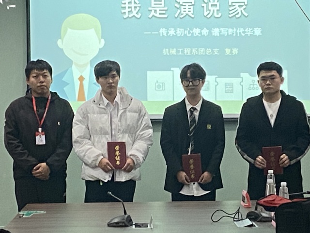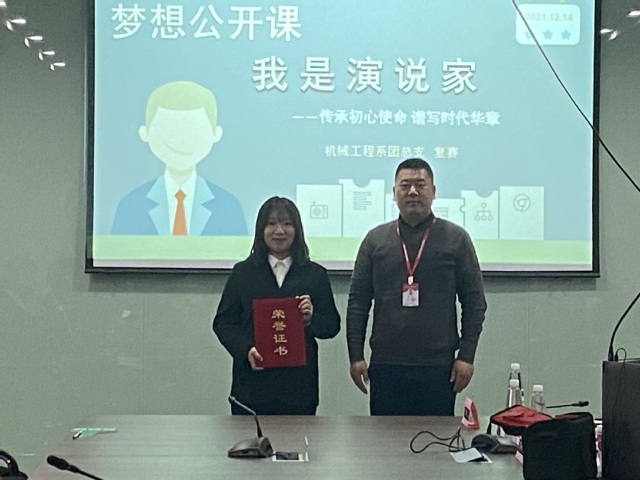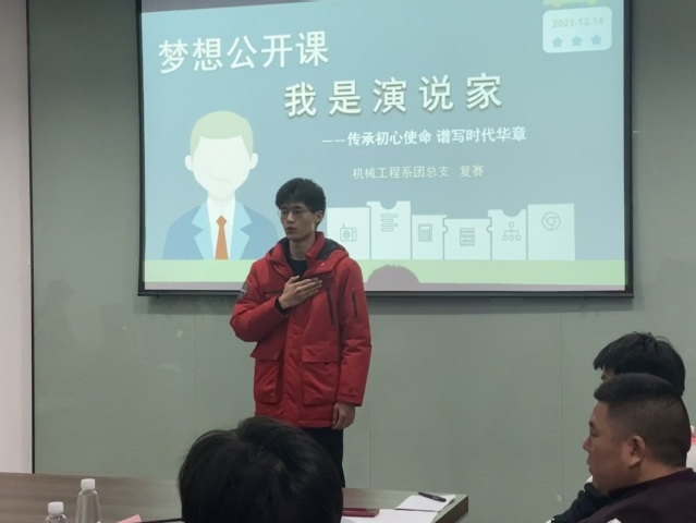 机械工程系团总支于2021年12月14日在学院育德楼203举办梦想公开课暨“中国梦属于青年一代——‘我是演说家’”复赛,本次比赛由办公室秘书长陈童主持,机械工程系党支部副书记李杰、团总支书记沈婷婷、学工干事顾航担任评委。