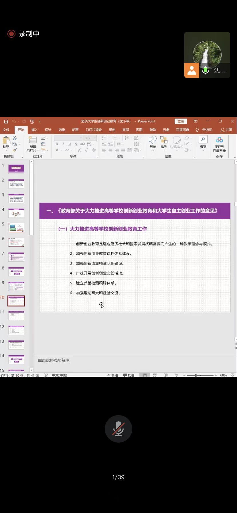 为提升大学生创新创业能力,激发大学生创业意识,宣传创业理念,培养创新创业精神,丰富大学生的创业知识,2021年12月23日下午19:00,邀请了学院就创业中心沈小军主任给系部2020级和2021级在校生1094名学生做了一场创业专题线上讲座。