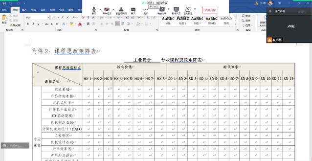 思政教育是高校教育的重要内容,是帮助大学生建立正确价值观和人生观的关键步骤。为落实立德树人的根本任务,全面推进课程思政建设,2022年3月22日下午,工业设计教研室开展专业课程思政矩阵图研讨会,对课程思政矩阵图进行进一步完善。
