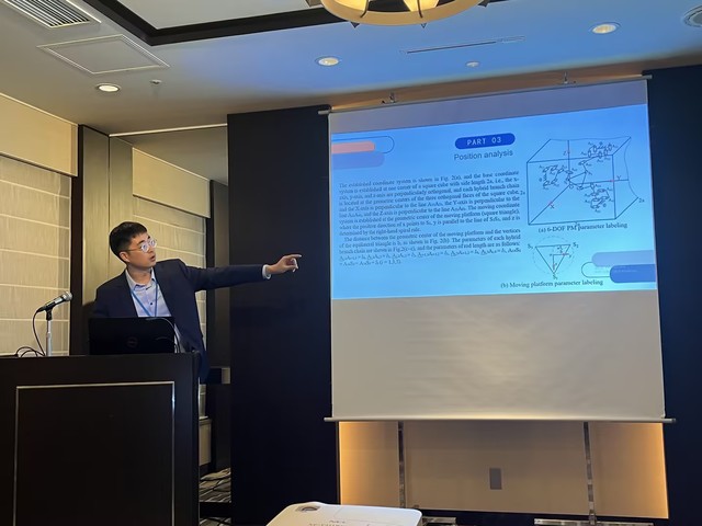 在本次大会上,赵一楠以第一作者发表了论文Structure Coupling-reducing Design and Closed-form Solution of a Three-translation Parallel Mechanism,并于11月6日进行了论文宣读,引发同行的广泛关注与讨论;同时,以合作作者身份发表了论文Design of a three-chain 6-DOF symmetrical parallel mechanism and solutions of its forward and inverse kinematics。此外,赵一楠还参与了多次其他会场的学术报告活动,并与同领域国内外专家学者进行学术交流,扩大学术影响力。