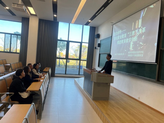 2023年11月21日下午,机械设计与制造教研室全体教师在勤学楼101教室与南京工艺装备有限公司开展了一次校企合作联合教研活动。本次教研活动邀请了2022年南京市劳模、南京工艺装备有限公司首席主任工程师王守珏。活动主题有两项:一是就业育人专题讲座;二是校企合作——深化职业教育“三教”改革推进教育教学创新研讨。