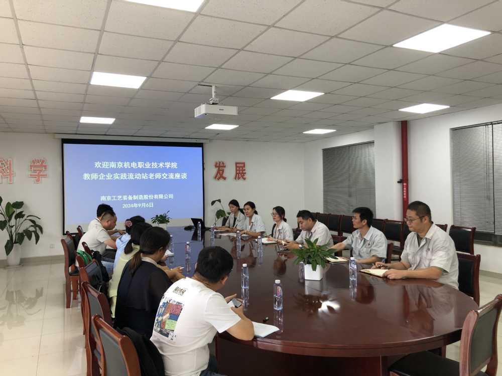 为进一步深化校企合作,强化高素质“双师型”教师队伍建设,推进教师深入企业开展实践锻炼,提升教师实践能力和创新能力,促进学校提高人才培养水平和企业科技创新能力。2024年9月6日,“南京机电-工艺装备教师企业实践流动站”团队前往南京工艺装备制造有限公司开展交流学习。南京工艺装备制造有限公司副总经理、综合管理部部长刘丽丽、综合管理部副部长王帆、技术部部长李小春、设备部部长彭朝胜、综合管理部主管陶冶、综合管理部干事丁鸽参加此次交流会。
