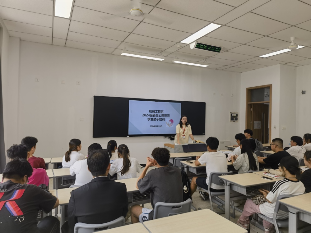 为贯彻落实省教育厅深入实施关爱青少年生命健康“润心”行动要求,也为2024级新生心理普测的顺利开展奠定基础,更加全面客观地掌握和评估同学们的心理健康状态,机械工程系心理气象站于2024年9月20日,在思学楼105开展了2024级新生心理普测学生助手培训,2023级全体心理委员参加此次培训。