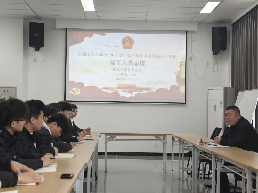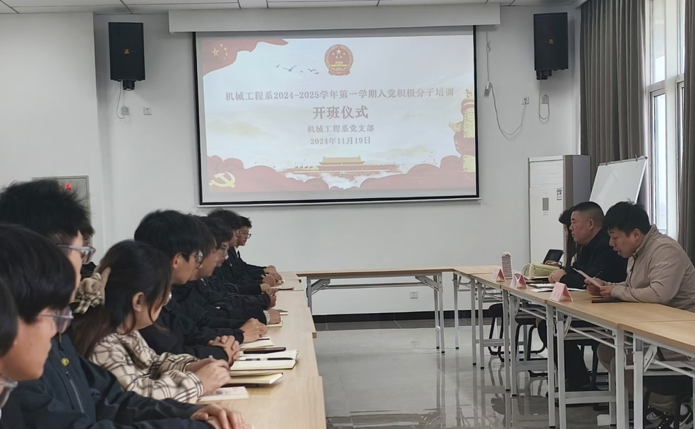 11月19日下午,机械工程系党支部第十五期入党积极分子培训班初级班开班仪式暨第一堂课在笃行楼401隆重举行。机械工程系党支部副书记李杰、青年统战委员王晨歌出席开班仪式,第十五期入党积极分子初级班全体学员参加。开班仪式由组织委员顾航主持。
