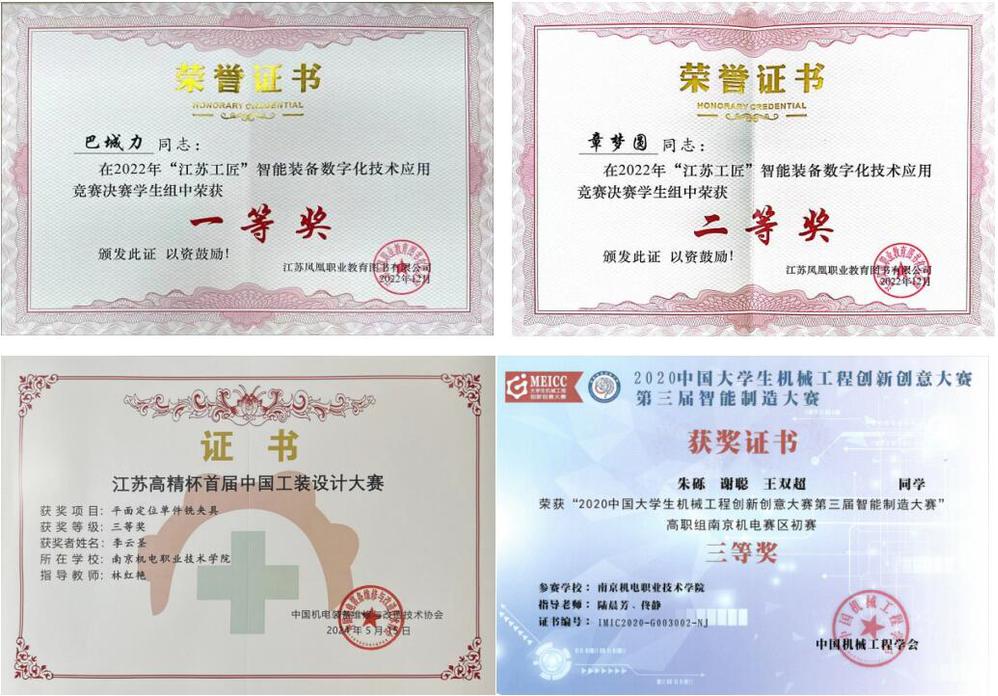 2020年参加中国大学生机械工程创新创意大赛,获得三等奖1次;2021年参加“西门子杯”中国智能制造挑战赛,获得三等奖2次;2022年参加“江苏工匠”智能装备数字化技术应用竞赛决赛,获得一等奖1次、二等奖1次;2024年参加中国工装设计大赛,获得三等奖1次。