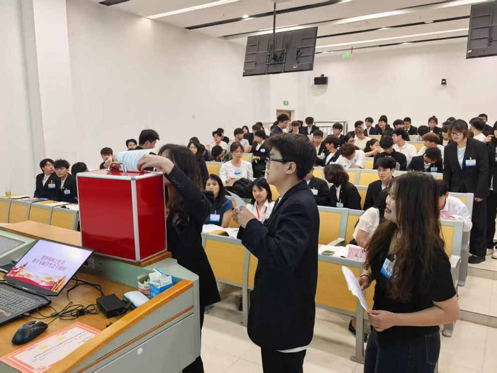 随后,大会步入投票选举阶段,现场秩序井然。代表们依次走上讲台进行投票,通过差额选举的方式,在6名候选人中孟浏、汪翔、陈文聪同学脱颖而出,成为江南网页版机械工程系第十五届学生会主席团成员。