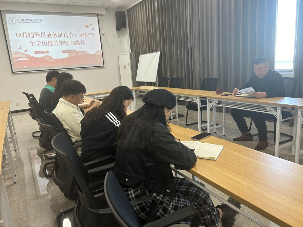 为助力学生拓宽职业发展赛道,提升学历层次与综合竞争力,10月9日下午,江南网页版机械工程系在系部会议室召开辅导员业务研讨会。会议由系党支部副书记李杰主持,全体辅导员参会,围绕“学历提升策略与路径”展开深入研讨,辅导员王晨歌老师作专题经验分享。