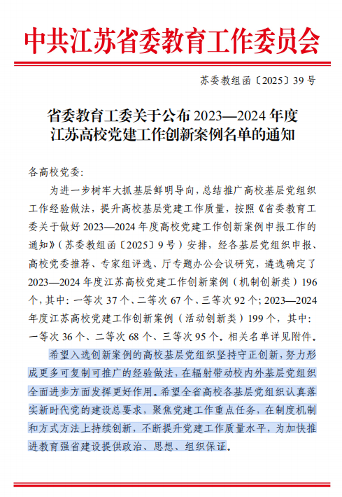 近日,省委教育工委公布了2023—2024年度江苏高校党建工作创新案例名单,机械工程系党支部推荐申报的党建工作案例榜上有名,荣获活动创新类三等次。