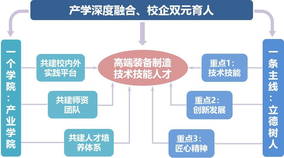 基于校企合作机制,以“一条主线、三项重点、一个学院、三个共建”为思路, 即以立德树人为主线,以技术技能、创新发展、匠心精神为重点,依托产业学院,校企共建智能制造实践教学基地和企业工程实践平台、共建师资团队、共建人才培养体系,实现产教融合、教研结合、教创结合,培养高端装备制造技术技能型人才,形成“产学深度融合、校企双元育人”人才培养模式,如图1所示。本专业核心型合作企业为中船鹏力(南京)智能装备系统有限公司。