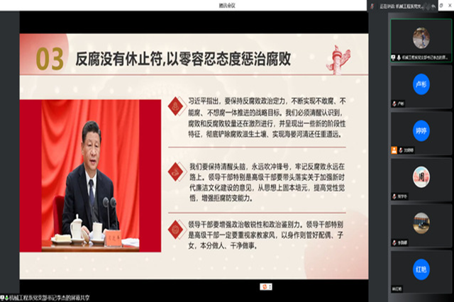 4月30日,机械工程系党支部召开政治理论学习会,学习习近平总书记在十九届中央纪委六次全会上的重要讲话精神。此次学习会由支部书记李杰主讲,支部全体党员参加了学习。
