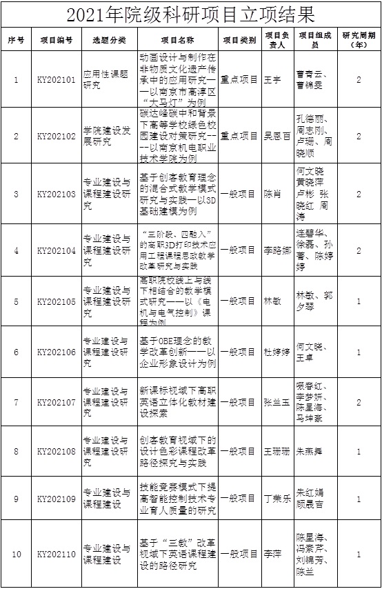 根据《关于申报2021年江南网页版院级科研项目的通知》《江南网页版科研工作管理办法》机电学院[2012]19号、《江南网页版科研项目管理办法》机电学院[2012]20号文件精神,经科研及校企合作处审核、专家组评议、学院批准,现决定对20项申报项目给予立项,其中重点项目2项、一般项目18项。其中《动画设计与制作在非物质文化遗产传承中的应用研究——以南京市高淳区“大马灯”为例》等2项为院级重点项目,《基于创客教育理念的混合式教学模式研究与实践—以3D基础建模为例》等18项为院级一般项目。