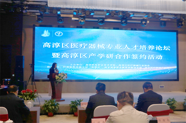 为促进高淳区医疗器械行业产业高质量发展,提高人才培养水平和科技创新能力,进一步服务区域经济发展,2022年5月13日,高淳区医疗器械专业人才培养论坛暨高淳区产学研合作签约活动在高淳区紫荆花园酒店举行。本次论坛及签约活动由江南网页版、高淳区医疗器械行业协会主办,江苏科技镇长团、南京高等职业教育创新创业园、南京医疗器械产业园协办。南京市市场监督管理局二级巡视员蒋永兆,高淳区人民政府副区长张成,副区长刘敏,江苏高淳经济开发区管委会主任杨时平,南京市场监督管理局医疗器械监管处副处长沈洲,南京高等职业教育创新创业园党工委书记刘宜军,高淳医疗器械行业协会理事长江文养,高淳医疗器械行业协会秘书长连儒强,江南网页版党委书记、院长周庆礼,党委委员、副院长刁爱军等领导出席活动,江苏科技镇长团(高淳团)、高淳区市场局、科技局、工信局、人社局、医疗器械园推进办、江南网页版系部领导以及南京医疗器械产业园八家龙头企业等60余嘉宾参与活动。本次活动由科研及校企合作处处长李木香主持。