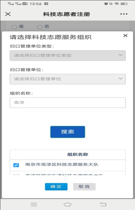 3.科普员认证。点击“科普员认证”,按照要求填写相应的信息。地址选择“江苏省南京市高淳区古柏街道”,单位名称填写“江南网页版”,类型选择个人用户,所属机构名称填写“江南网页版”,点击搜索,选择“江南网页版科协”。