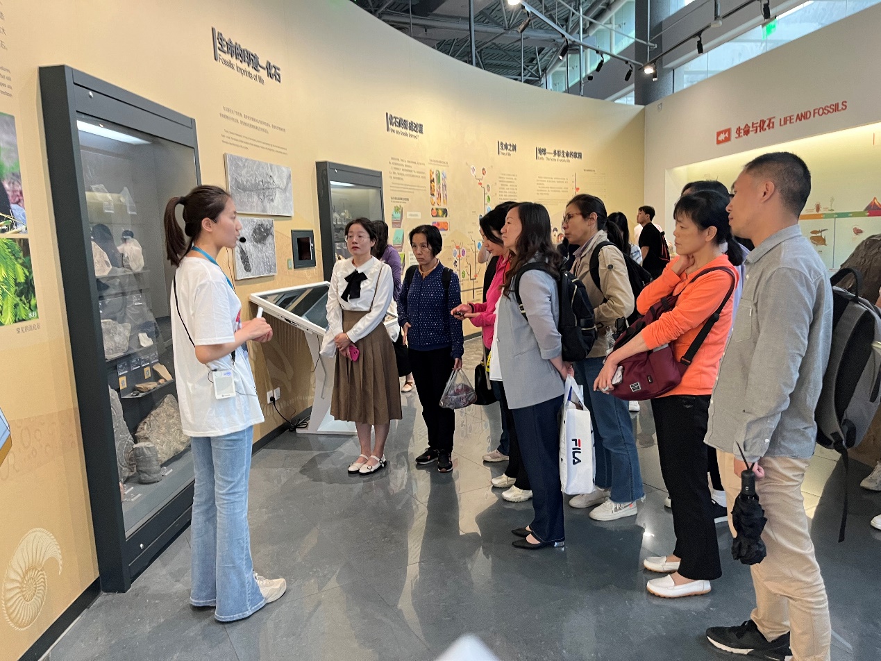 讲解员的带领下,学校科技工作者们在生物进化主题展了解进化中的生命、演变中的地球,在生物进化专题展了解澄江动物群、恐龙、微观世界、生物登陆、无脊椎动物、南京地史演变、南京直立人等知识。科技工作者们认真聆听讲解员的介绍,感受地球和生命的沧桑巨变,在触摸菊石中,感受体验科学的乐趣。