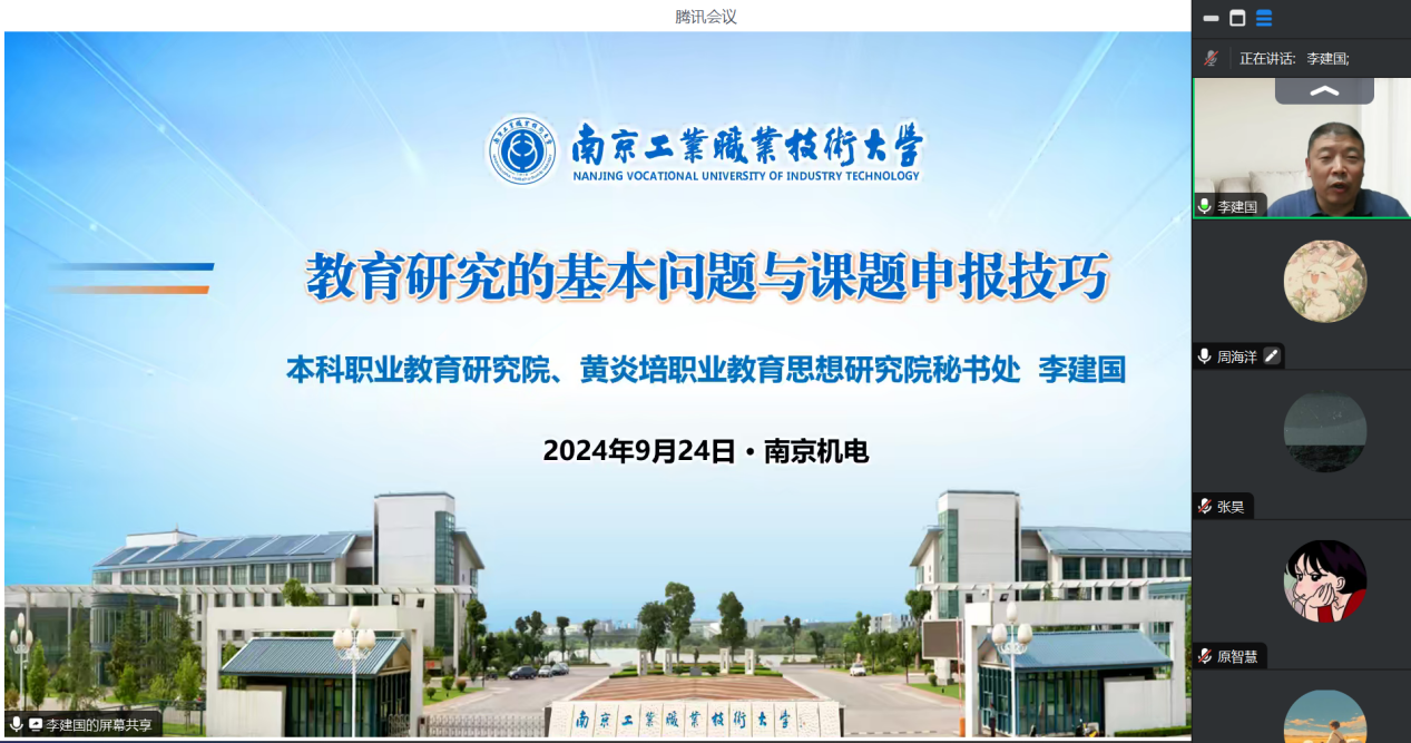 为进一步推进学校“两双工程”建设,提升我校教师的科研素养与实践创新能力,2024年9月25日晚上,学校诚邀南京工业职业技术大学本科职业教育研究院院长李建国为学校教师开展2024年“点亮科研灯塔 引领教育未来” 教师科研能力提升系列活动之专题讲座。