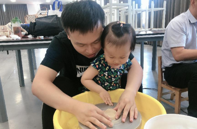 上午进行的是拉坯体验活动,蓝岛创客空间候俊老师介绍了制作的方法和重点。拉坯主要是利用拉坯机产生的离心运动,在旋转过程中,对含水半固化状态的泥料按照设计构思拉伸成型。制作过程中要注意手要稳,定好中心,不跑偏,抚底防开裂,做出形状后整体拔高,最后整理作品的细节。参加活动的教职工及其子女都热情高涨地投入到拉坯的制作中。初次制作的过程中出现了坍塌、开裂、中心跑偏等情况,但是没有人放弃,特别是小朋友们都耐心的一遍遍重头做起,不断总结失败原因,调整自己的制作过程,最终获得自己心中满意的陶艺作品。