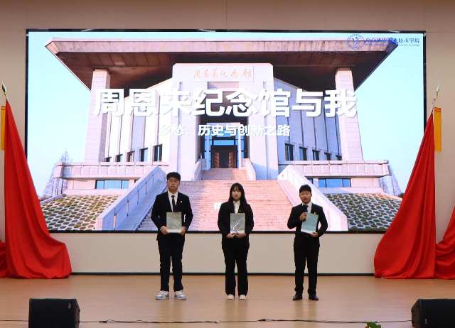 最后,来自淮安的蒋翔宇同学以周恩来总理为榜样,讲述了自己如何在创新道路上坚定前行的故事。淮安不仅是他成长的摇篮,更是他心灵的归宿。周恩来总理的“为中华之崛起而读书”的誓言,不仅激励了他自己,也成为蒋翔宇在创新实践中不断前行的动力源泉。他漫步在校园,浓郁的创新氛围让他不禁想起淮安那座庄严肃穆的周恩来纪念馆。那里镌刻着总理一生的辉煌与家国情怀,如同一座灯塔照亮他前行。在周总理精神的鼓舞下,蒋翔宇将创意播撒于现实,在双创道路上不断尝试与突破,深刻体会到了创新的价值与魅力。他表示,将带着周总理那不朽的精神火种,继续在广阔舞台上探索未知,以创新成果照亮前行之路。