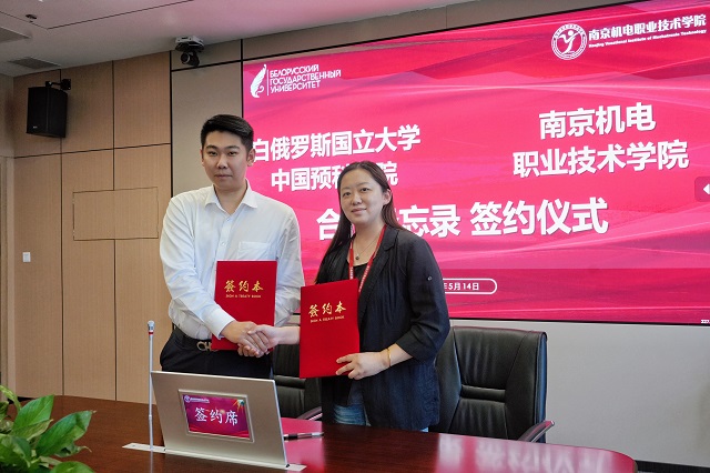 随后,我校与白俄罗斯国立大学中国预科学院签署了合作协议。签约仪式上,学校党委委员、纪委书记、工会主席姜振宇与白俄罗斯国立大学中国预科学院中方院长张践共同为“南机电•中俄教育中心”揭牌。