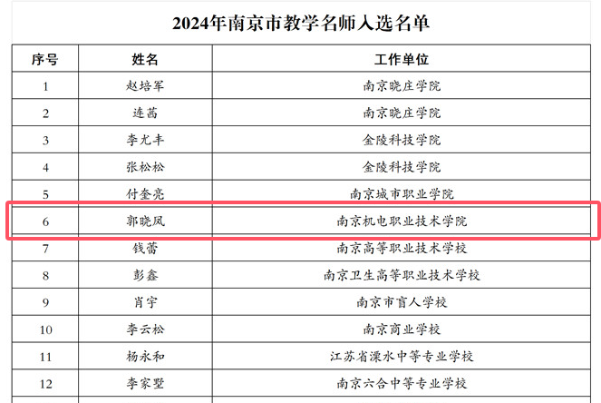 近日,南京市教育局公布了2024年南京市教学名师人选,我校郭晓凤老师榜上有名。