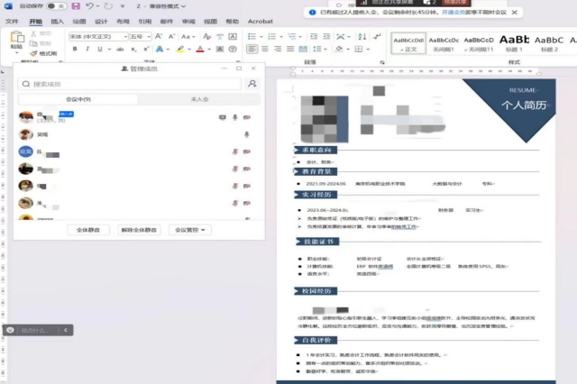 简历诊断环节,堪称一场细致入微的 “蜕变之旅”。吴瑶老师率先开启知识宝库,深入浅出地剖析简历架构,点明关键要素的呈现技巧;梁娟娟老师和张文婷老师则化身 “贴心参谋”,拿着学生简历,结合日常对学生闪光点的观察,从学业成绩到社团活动,挖掘那些被忽视的优势。企业HR更是凭借实战视角,直击痛点,给出贴合市场需求的修改建议。师生研讨,逐行雕琢每一份简历,从专业技能的精确描述,到实践经历的深度润色,再到排版布局的视觉优化,让原本平淡无奇的简历脱胎换骨,毕业生的个人优势得以淋漓尽致地展现,求职竞争力飙升。