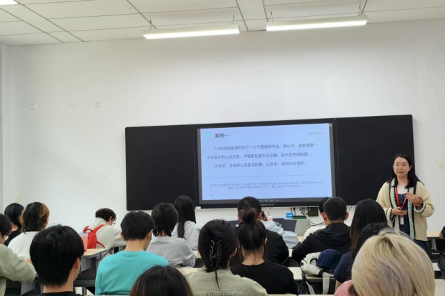 培训中,在“专业困扰”环节,沈婷老师结合案例,指出了同学们在专业学习中的常见困扰,如志愿调剂、兴趣不符、学业压力等,并强调积极心态对学习效果的重要影响。同时,沈婷老师还提出“个性与专业匹配三要素”,帮助同学们理性看待专业问题。在“就业困扰”部分,沈婷老师通过SWOT分析法,引导同学们理性评估自身优势与行业趋势,鼓励大家主动探索职业机会。此外,她还分享了“陪伴—疏导—安慰—求助”的朋辈互助四步法,帮助心理委员们在同学面临困境时提供有效支持。