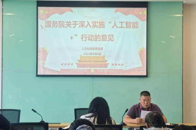 2025年9月4日,人文社科系党支部召开专题学习会,深入学习贯彻《国务院关于深入实施“人工智能+”行动的意见》(国发〔2025〕11号)文件精神。系党支部书记李杰主持领学,支部全体党员教师参加学习,并结合人文社科领域发展实际展开热烈讨论。