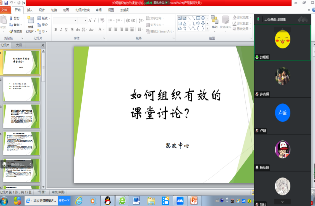 紧接着,大家围绕如何组织有效的课堂讨论展开了充分的讨论。大家一致认为:一、应该充分运用学习通,开展多种形式的课堂讨论。二、课程设计要精心设计主题,并把控好讨论全局,做到收放自如。三、教师须正确、合理地运用即时性评价用语来提高课堂教学的质量。