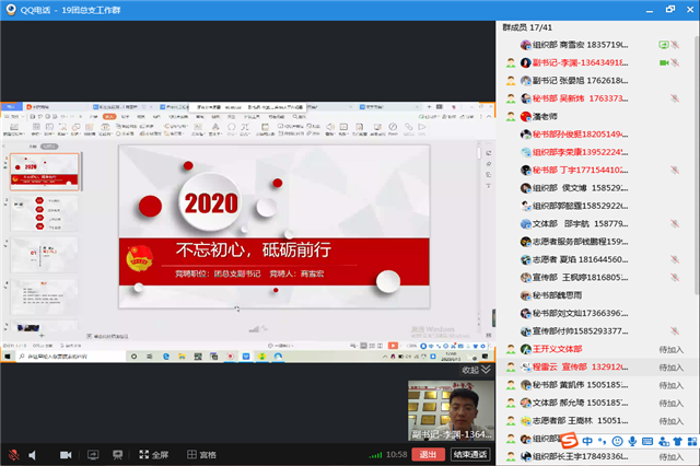 为加强团组织自身管理,提高团干队伍整体素质,为团总支提供有力的组织保障,并服务好团员青年。江南网页版自动化工程系团总支二轮换届竞聘于2020年6月15日下午17:30在博学楼B301举行。因受疫情影响,本次竞聘选在线上举行。参加本次竞聘评委的有自动化工程系团总支书记潘久伟老师、2018级学生副书记和各部门部长。