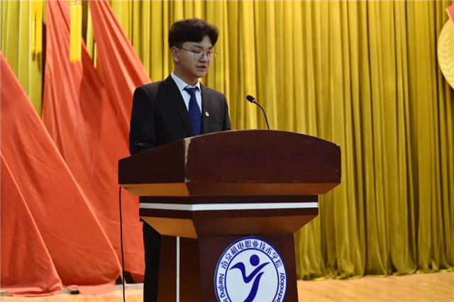 大二团学干部代表院学生会副主席兼社团联合会副主席韩东林同学在发言中告诉同学们,作为一名学生干部,要明确定位意识,坚持团的政治信仰,在服务他人中,重视积累,勤于思考,善于发现和解决问题,勇于承担,知行合一,学习与工作兼得。同学们要拥有脚踏实地的态度、自强不息的精神,认真参加培训,开拓眼界,增长才干,为学院学生工作做出贡献。