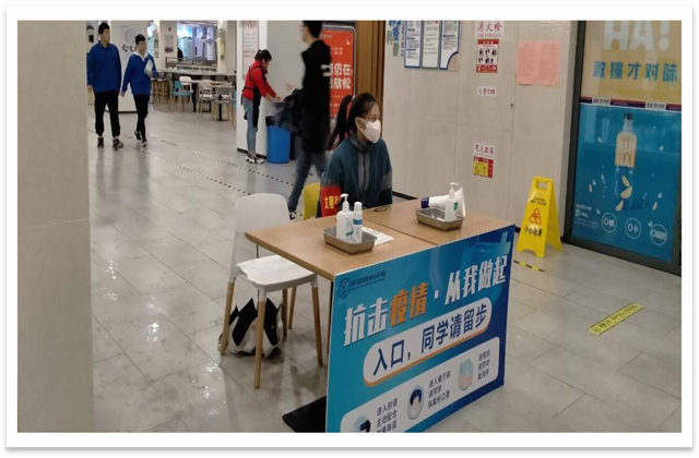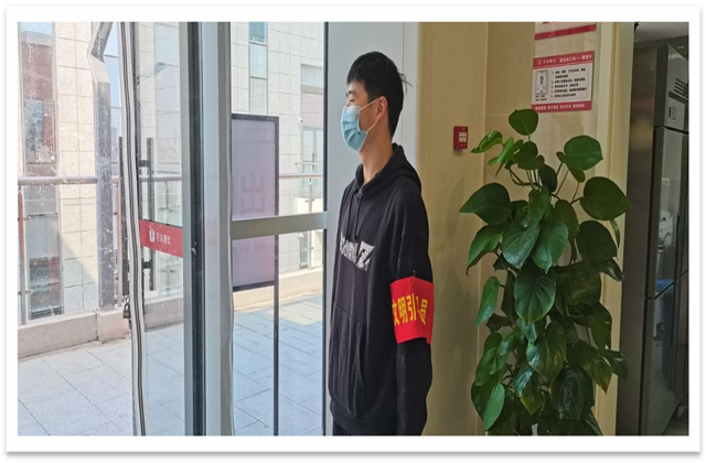 从10月18号开始,志愿者正式上岗。“请大家保持一米间距,戴好口罩,测量体温后进入食堂,并隔座就坐。”志愿者戴上口罩和文明引导员的袖章,积极热情地为大家服务,维持疫情期间食堂的就餐环境。