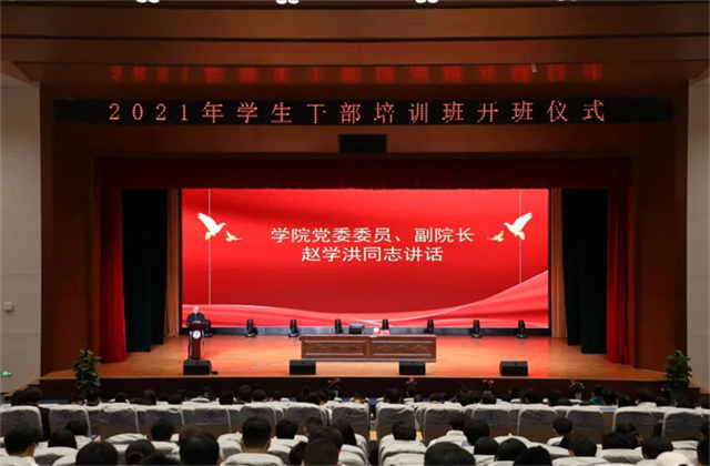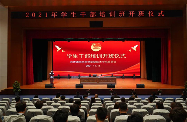 为推进“两聚一高”新实践、建设“强富美高”新江苏,聚焦“四新”机电建设,进一步加强学习意识形态工作,牢牢把握正确的政治方向,加强和完善我校学生干部队伍建设和管理工作,充分发挥学生干部在大学生思想政治教育中的桥梁和纽带作用,提高学生干部的政治素质、理论水平和业务能力,促进我院学生工作的深入开展,2021年11月16日,由学院团委主办的2021年学生干部培训班开班仪式在报告厅举行。党委委员、副院长赵学洪,纪委副书记、党委工作部部长周启国,学生工作处处长张宝中,团委书记唐钰峤,电子工程系党支部书记吴伟萍,机械工程系党支部副书记李杰,自动化工程系党支部副书记高水冕,人文社科系党支部副书记叶绘出席开班仪式,各系团总支书记、社团指导老师及全体学生干部参加开班仪式。开班仪式由团委金慧敏老师主持。