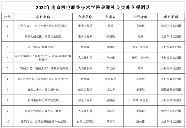 为深入学习宣传贯彻习近平新时代中国特色社会主义思想和党的十九届六中全会精神,贯彻落实习近平总书记关于青年工作的重要思想,深入学习习近平总书记在庆祝中国共产主义青年团成立100周年大会上的重要讲话精神,引导和帮助广大青年学生上好与现实相结合的“大思政课”,在社会课堂中“受教育、长才干、作贡献”,迎接党的二十大胜利召开,根据“三下乡”社会实践活动安排,经自主申报,各团总支、青马班审核推荐,校级专家评审,确定以下10个项目为2022年江南网页版暑期社会实践重点立项项目,并对立项的校级重点项目进行经费支持,现公示如下:
