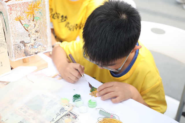 “非遗文创DIY”团队带来了精彩纷呈的非遗手工艺品制作展示。团队成员们现场展示了掐丝、花灯、蓝晒锦灰堆扇子等非遗技艺,并邀请少年儿童亲手体验制作过程。这一活动不仅让人们感受到了传统文化的魅力,也增强了他们对中华文化的认同感和归属感。