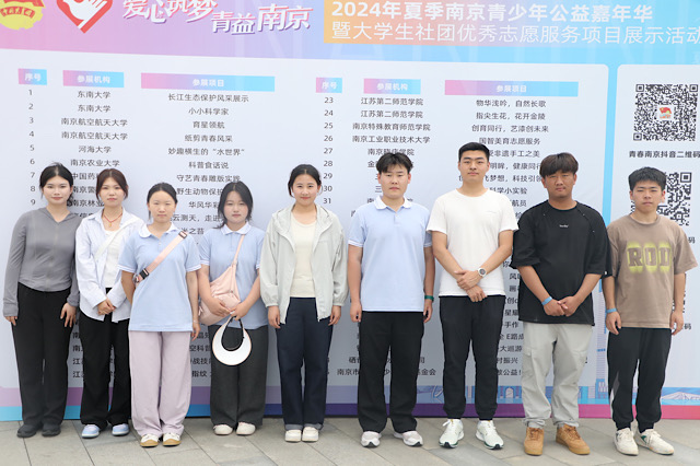 6月1日,由共青团江苏省委和江苏省青年志愿者协会指导,共青团南京市委和南京市青年志愿者协会主办的“爱心筑梦·青益南京”2024年夏季南京青少年公益嘉年华暨大学生社团优秀志愿服务项目展示活动在南京金陵STYLE成功举办,我校“非遗文创DIY”团队和“‘南京号’星耀科普行”团队参加展示活动。这场嘉年华为青少年们提供了一个展现自我、学习交流的平台,为南京的文化繁荣和社会进步注入了新的活力。