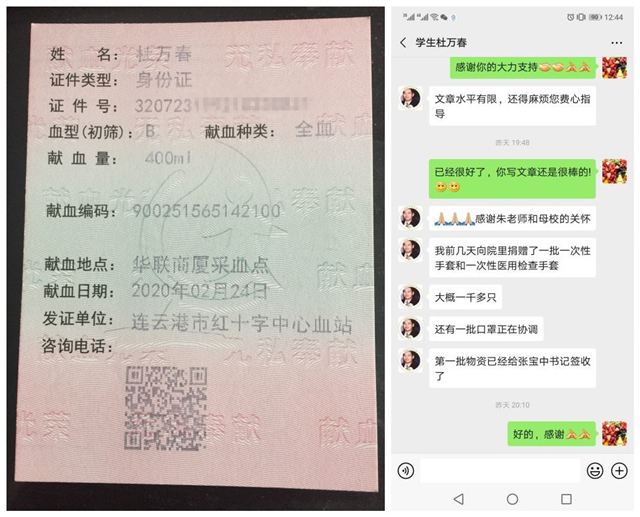 经过多方筹措,2月10日,杜万春校友捐赠的首批防疫物资从宿迁寄出,当天到达学院,交付学工处,包括消毒液和一次性手套。据悉,根据学校物资储备情况,杜万春还将继续捐赠,第二批捐赠物资包含全自动杀菌净手器、口罩、医用手套等,将于2月28日前送达我院。杜万春校友表示,希望能够用这批物资助力母校打赢这场疫情防控阻击战,尽自己的绵薄之力,回报母校多年的教育培养。