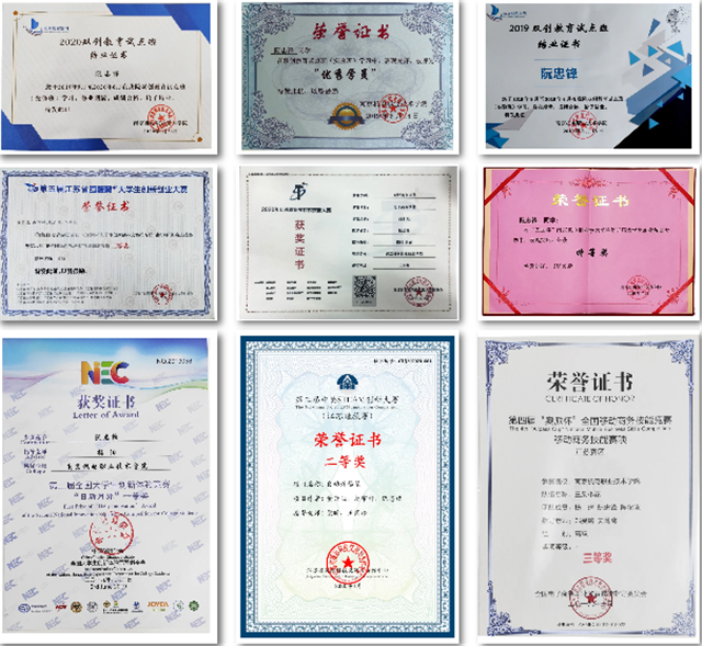 入学以来,先后获得社会实践先进个人、优秀共青团员、企业奖学金等荣誉,荣获全国大学生创新体验竞赛一等奖、江苏省互联网+大学生创新创业大赛二等奖、江苏省职业院校技能竞赛二等奖、江苏省第十五届大学生职业规划大赛二等奖等奖项。