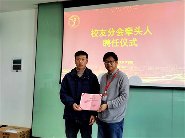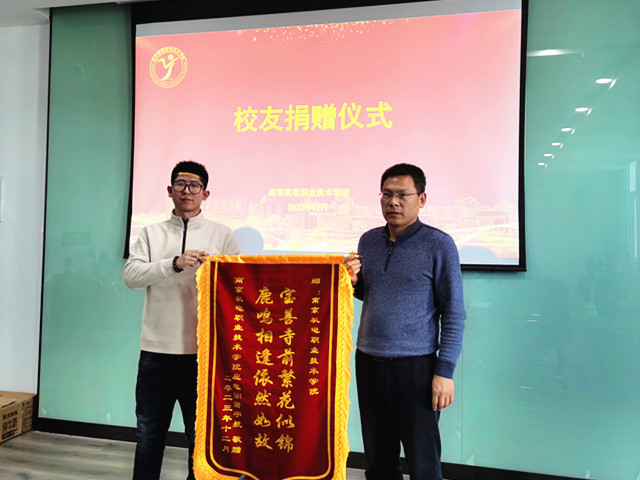 捐赠仪式上,就职于南京地铁集团的谢宇航向母校赠送了“宝善寺路繁花似锦 鹿鸣相逢依然如故”锦旗感谢学校的培养;担任甄优好市场总监的那荣誉给校友们带来了价值2000元的产品供大家品尝。另外,校友会还聘任了邹传付(就业在苏州)和殷浩炜(就业在泰州)两位校友担任分会筹备委员会负责人。会后,全体人员在校门前合影留念。