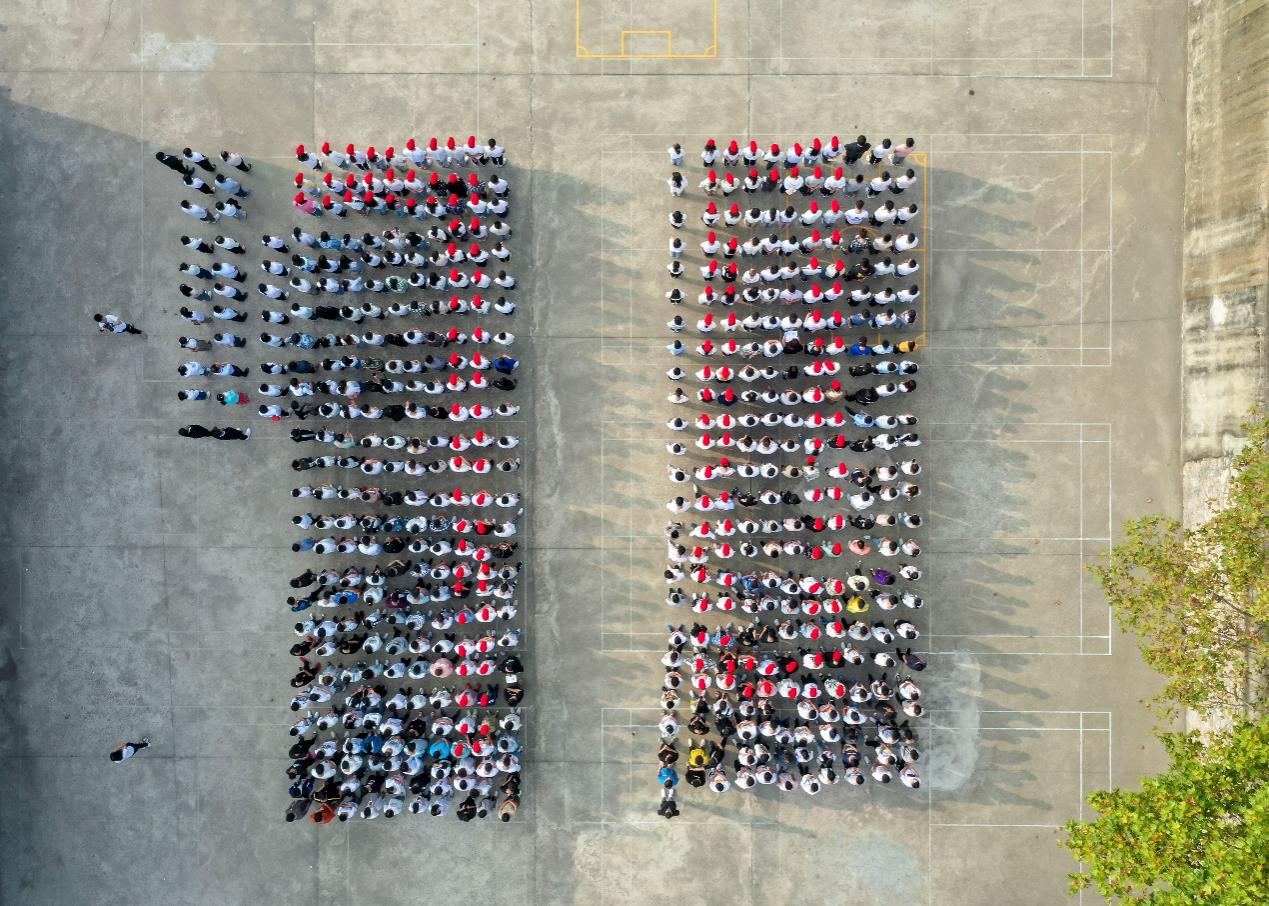 清晨七点,迎着初升的朝阳,江南网页版650余名师生满怀崇敬之情聚集在操场,153名同学在队伍中用小红帽摆出“70”字样。