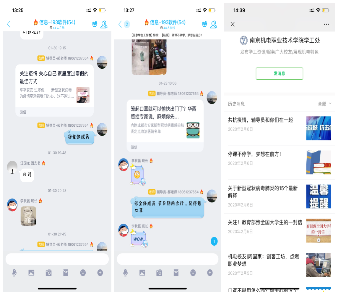 班委各司其职,充分利用网络开展线上班级管理工作,班长负责每日健康报备管理工作,学习委员负责线上网络学习工作,团支书负责抗击疫情文章推送工作。