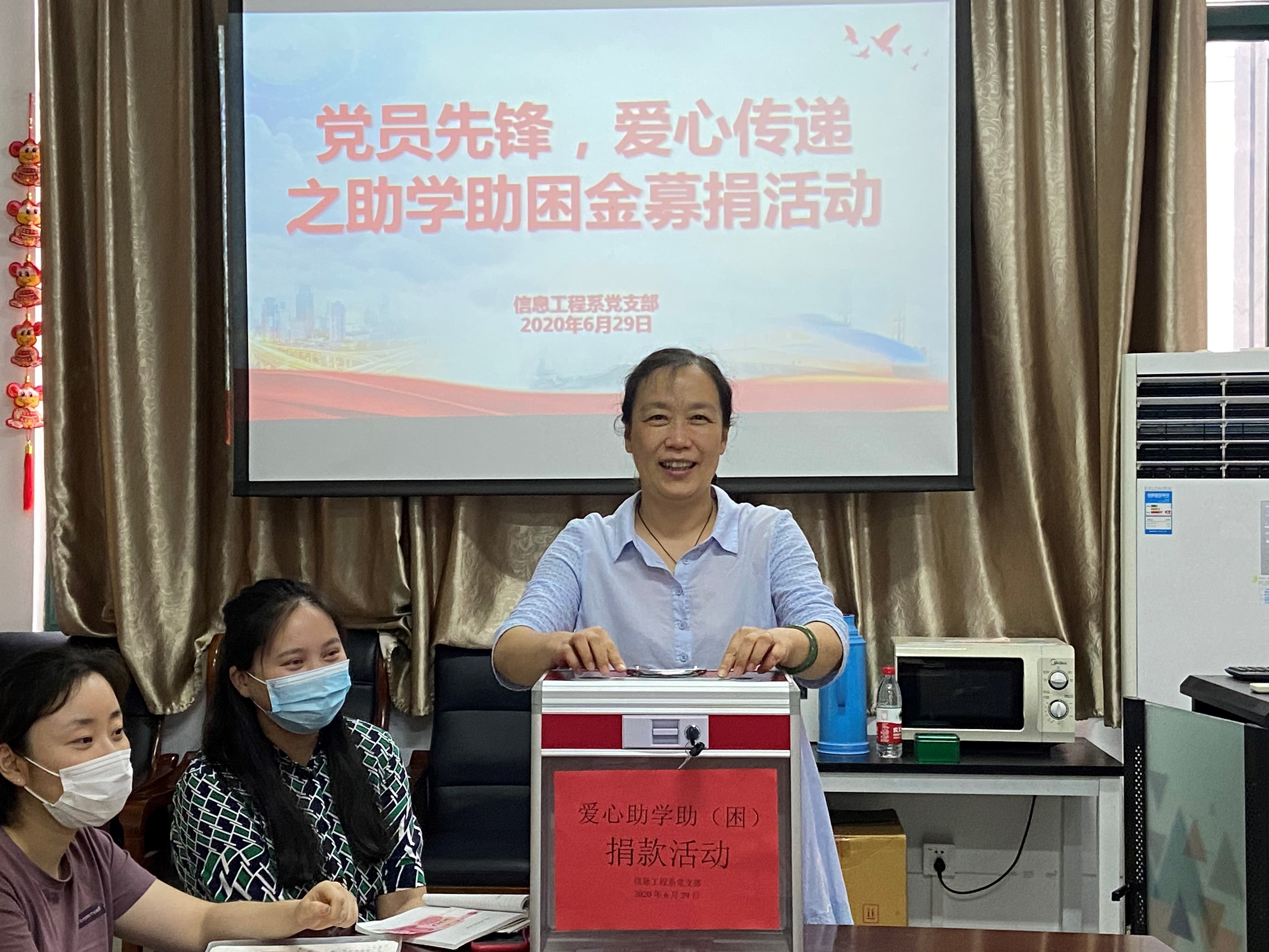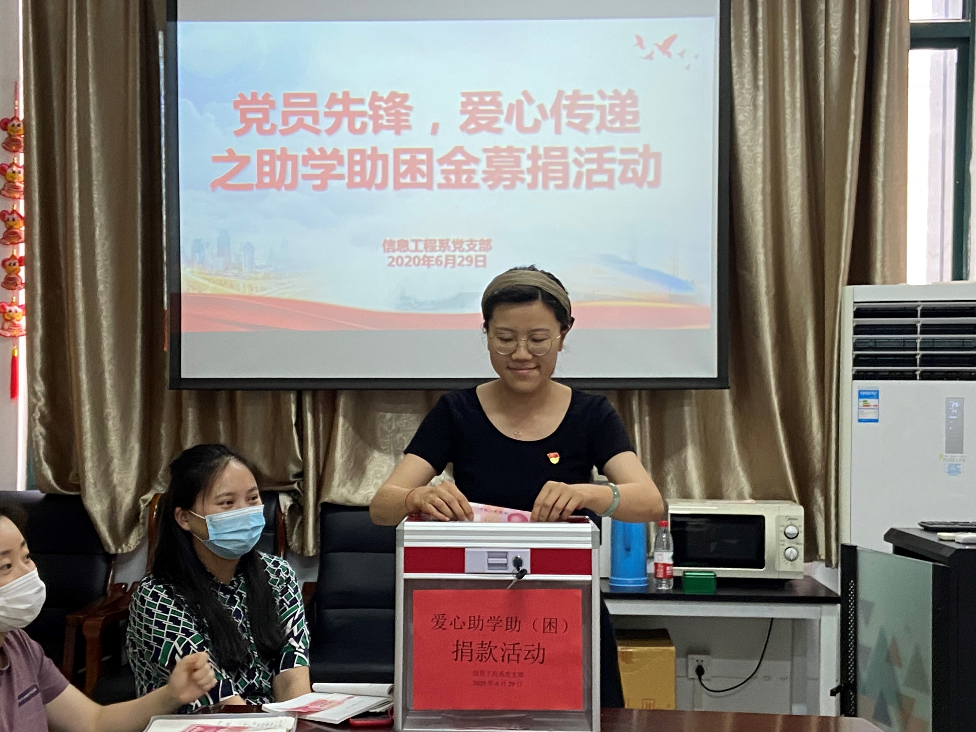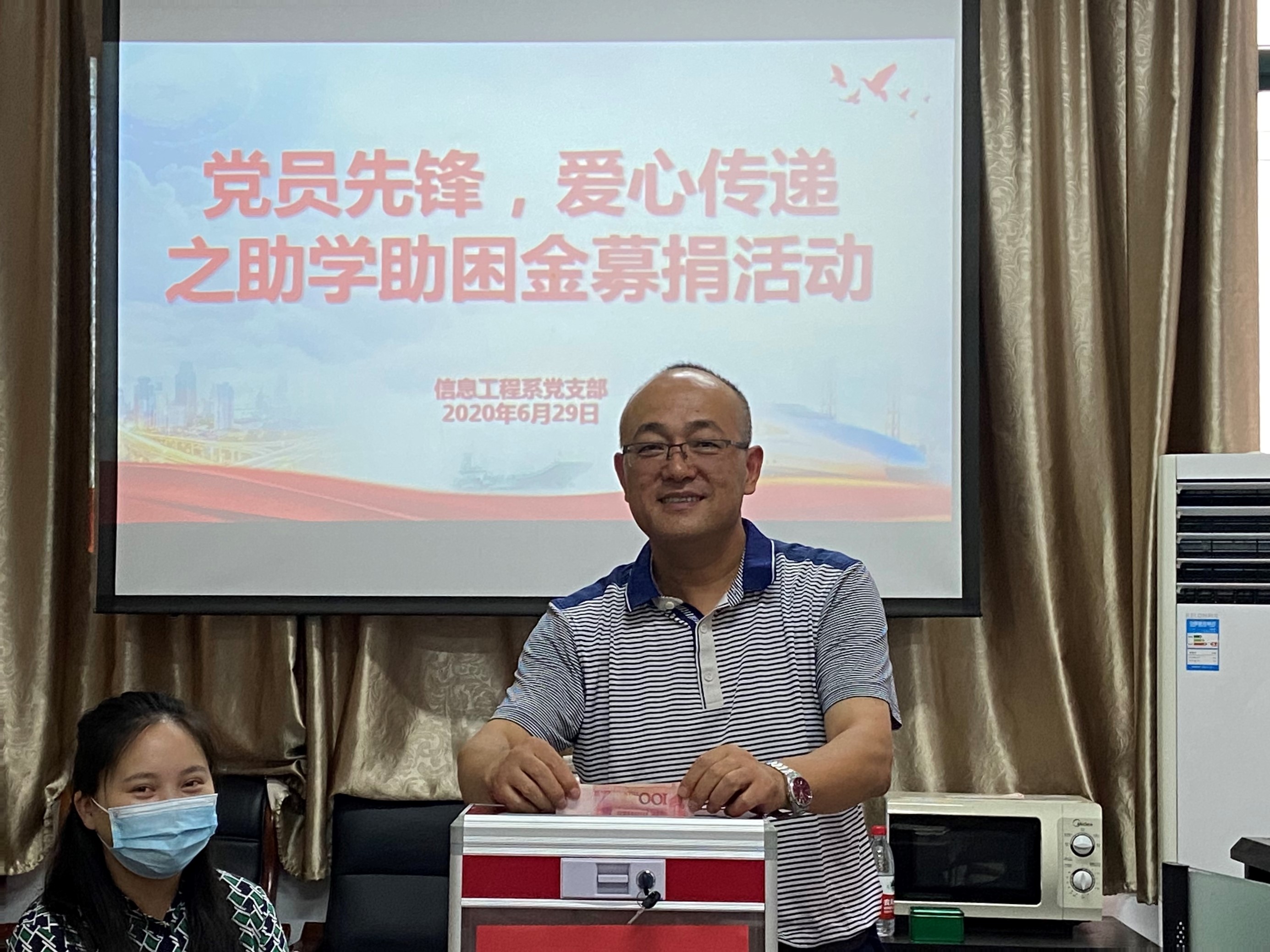 为深入贯彻落实党的十九大精神,弘扬中华民族扶危济困、助人为乐的传统美德,贯彻以人为本的理念,积极响应学院党委在全院各级党组织和全体党员中开展“七彩飞扬•五亮强基”品牌特色活动中的“暖心行动”,2020年6月29日,信息工程系党支部组织了一场爱心助学助困金募捐活动,支部全体党员参加活动,驻点领导副院长赵学洪也参加了本次活动。