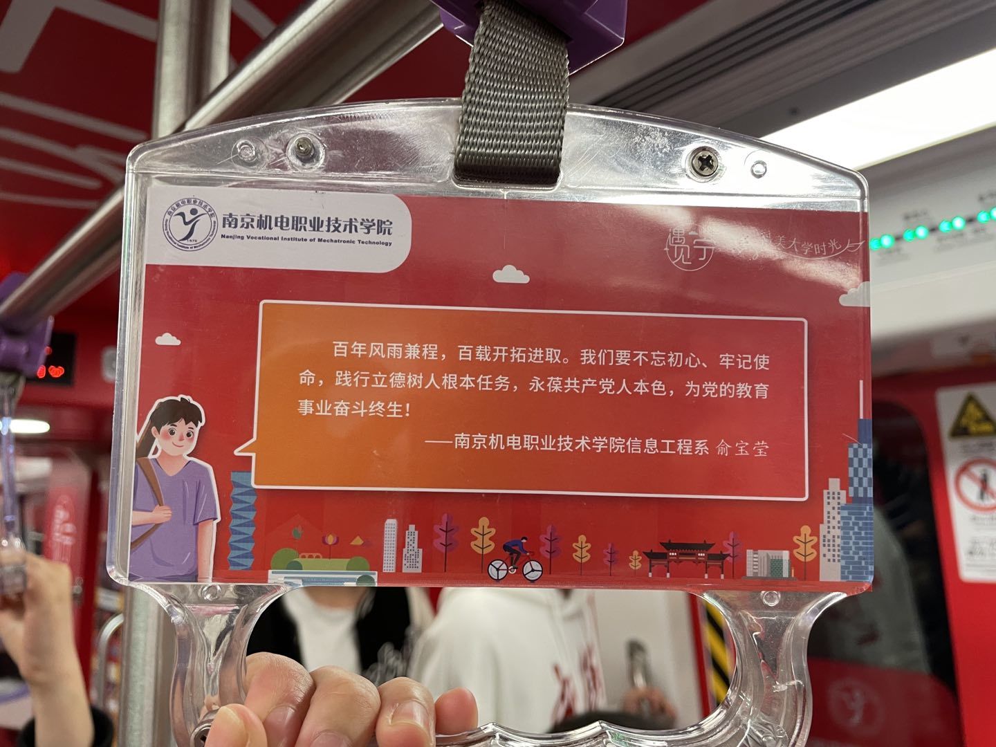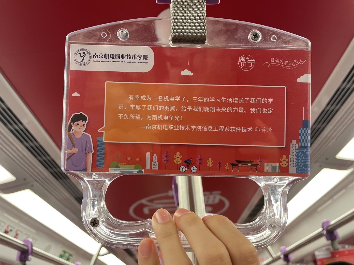 “遇见宁——最美大学时光”红色地铁专列发车,熟悉的南机电风景,动人的南机电故事,一篇篇一幅幅一帧帧尽显这车厢中。全车共6节车厢,以红色、橘色为主色调,讲述12所高校历史上的大事件、校史中的党史故事、学校开展党史学习教育的成果等遍布车身、车窗、椅背贴、拉手等地方。