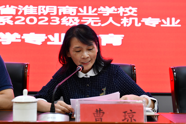 首先,曹琼女士代表淮阴商校,对我校、企业、全体学生以及家长的到来,表示热烈的欢迎,接着,对23级无人机专业学生致以殷切的祝愿,希望他们能在6年的学习生涯中,只有持之以恒学习知识、沉下心来锻炼技能,才能迎接美好未来。
