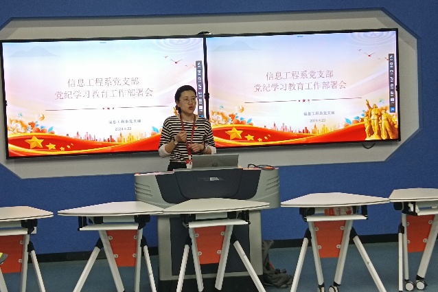 4月23日下午,信息工程系党支部召开了党纪学习教育工作部署会,支部书记胡枫同志详细解读了信息工程系党支部开展党纪学习教育的工作方案,支部全体党员教师参加会议。