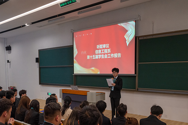 随后,信息工程系第十五届学生会副主席丁明杰作信息工程系学生工作报告。报告总结了过去一年里信息工程系学生会在思想引领、组织建设、创新发展、文化体育、社会实践等方面所取得的显著成绩。同时,还提到不足和改进之处,包括加强活动宣传、提高活动质量、加强与同学们的沟通等。