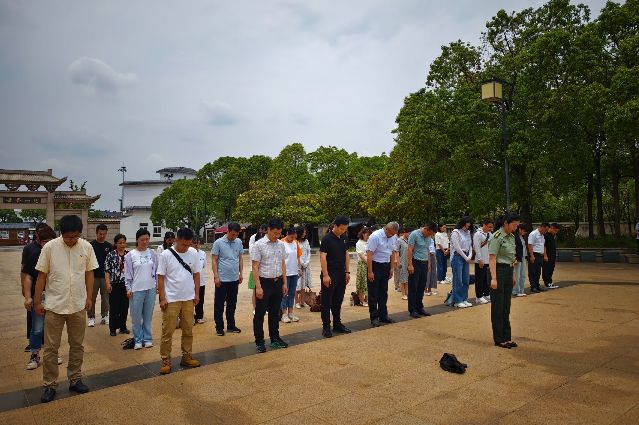 随后,全体党员步行至“苏南抗战胜利纪念碑”前,郝麒、张进宝同志向革命先烈们敬献花篮,刁爱军同志整理挽联。同志们怀着无比崇敬的心情,默哀致敬,深切缅怀烈士不朽功绩,追忆伟大抗战精神。