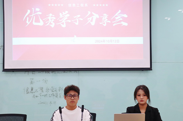为更好地帮助学生树立远大理想,开拓学习视野,改进学习方法,找到自己的目标,2024年10月12日在“一站式”学生社区举行了由信息工程系学生会举办的优秀学子分享会顺利进行。本次会议由信息工程系21届学生会主席潘裕镇与22届学生会文体部部长赵彤担任主讲人。