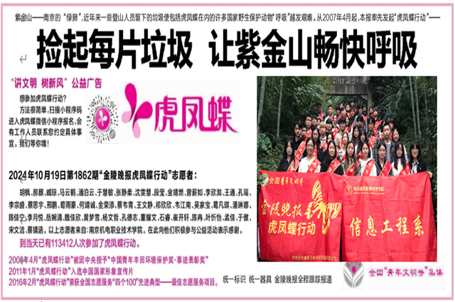 为进一步激发信息工程系师生的环保意识和奉献精神,10月19日上午,信息工程系党支部书记胡枫、青年委员、关心下一代工作委员会秘书长郝麒、宣传委员臧琼带领20名团学骨干、10名家庭困难学生,共同前往南京紫金山开展“虎凤蝶”志愿行动。通过党建带团建,以实际行动守护自然环境,推动绿色发展。