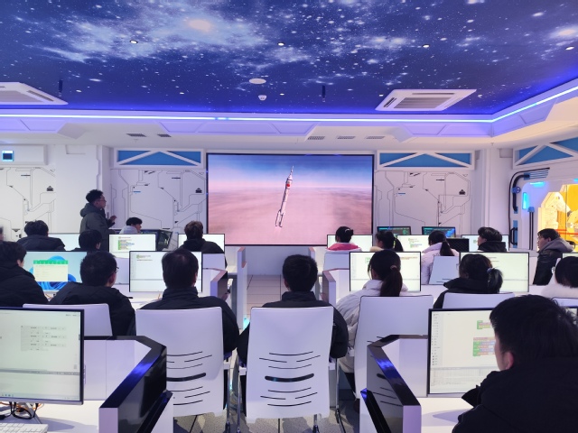 课上,两位同学坐在控制台沉浸式体验了火箭从发射准备、点火升空,到进入预定轨道的全部过程。学生们仿佛身临其境,感受到了火箭发射时的震撼与激情。