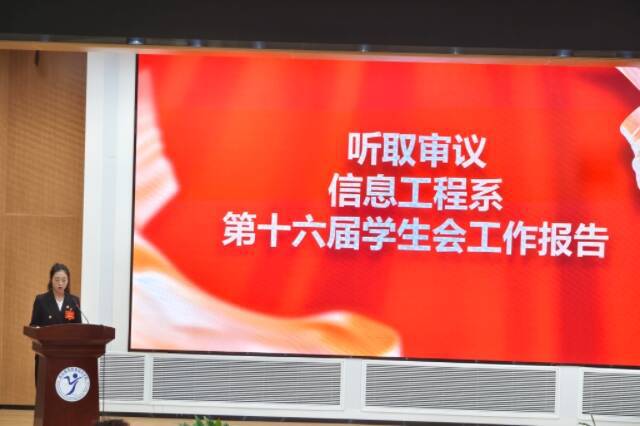 随后,信息工程系第十六届学生会副主席魏佳欣作信息工程系学生工作报告。报告总结了过去一年里信息工程系学生会在思想引领、组织建设、创新发展、文化体育、社会实践等方面所取得的显著成绩。同时,还提到不足和改进之处,包括加强活动宣传、提高活动质量、加强与同学们的沟通等。